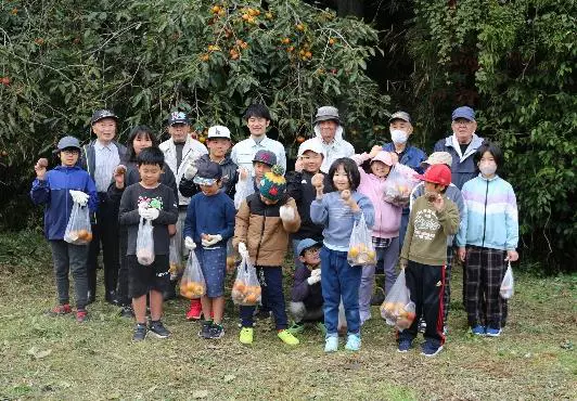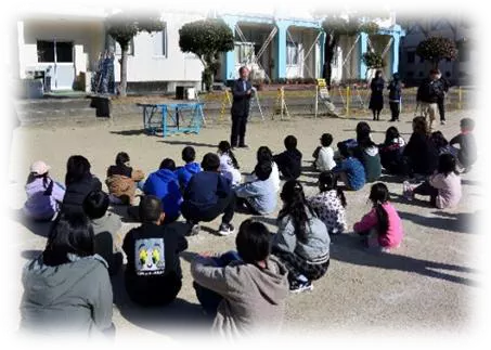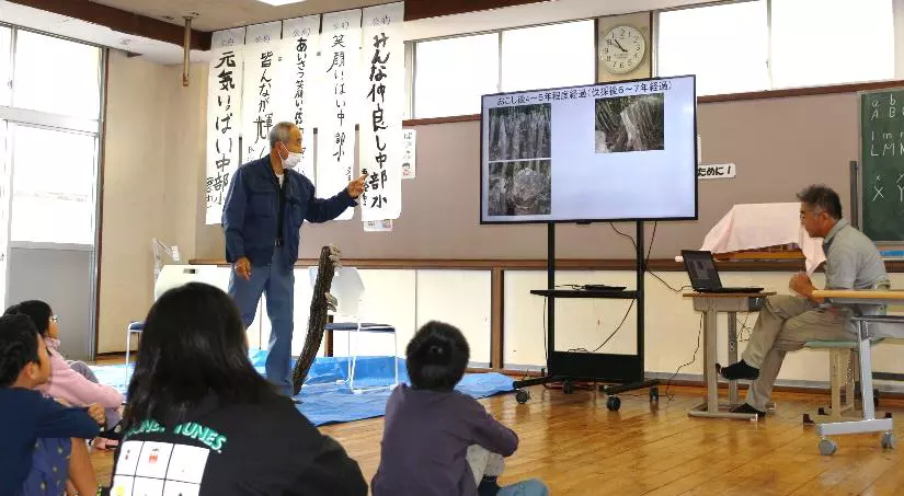 令和7年11月5日に、中部小学校の3、4、5年生が椎茸ほだ木起こし授業を行いました。 授業の風景です。