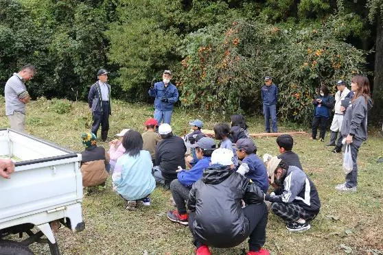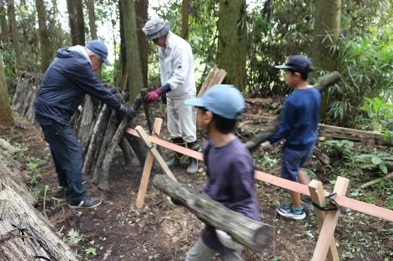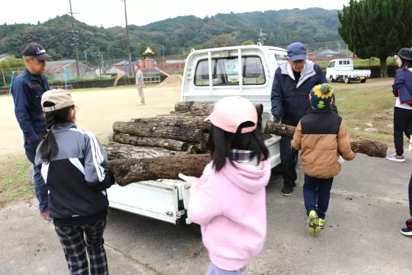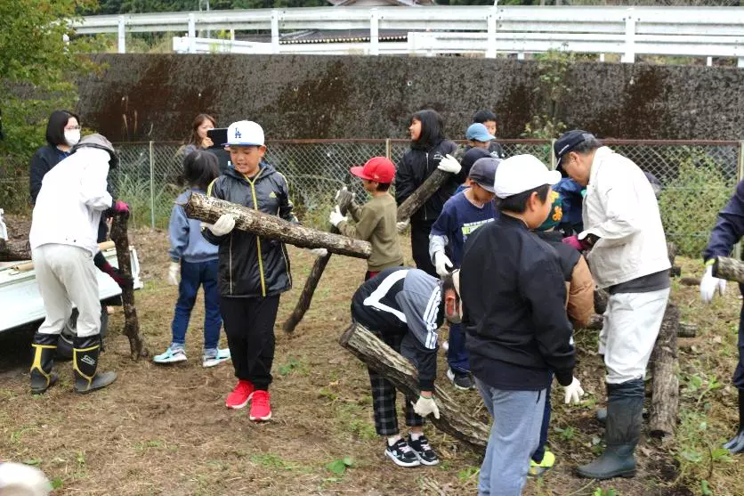 中部小児童《3・4・5年生14人》、椎茸ほだ木起こし授業